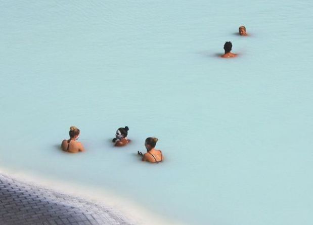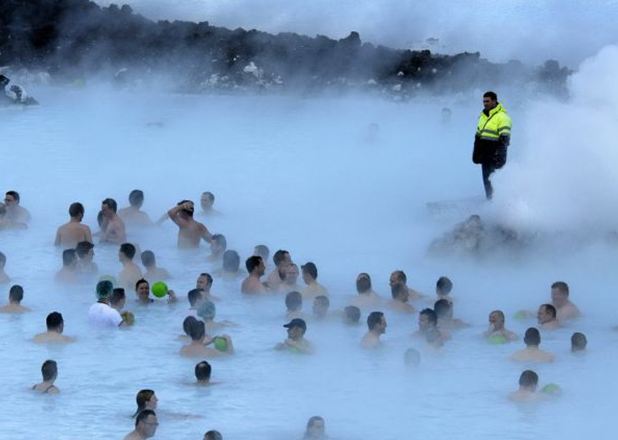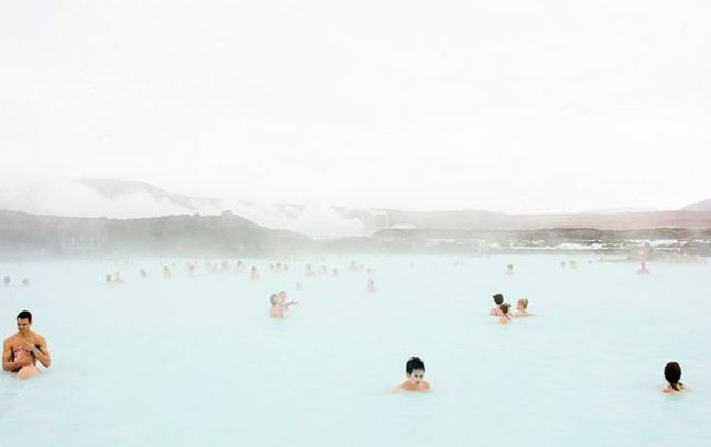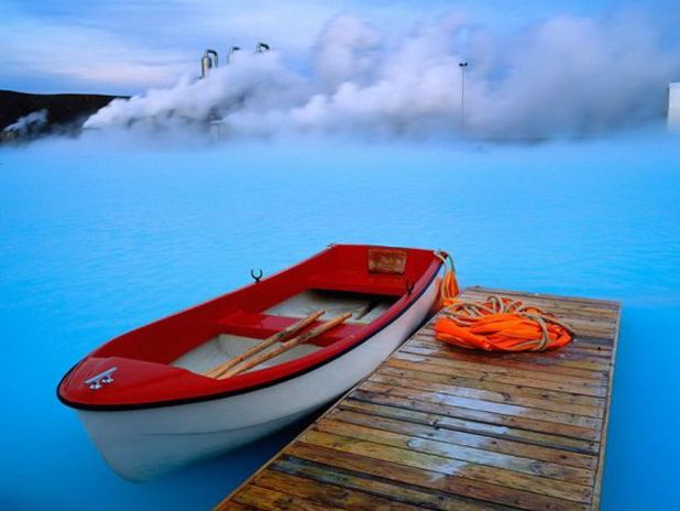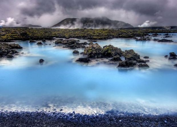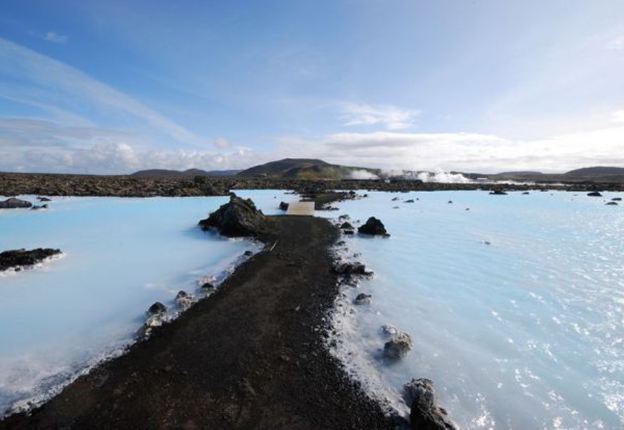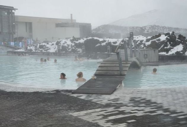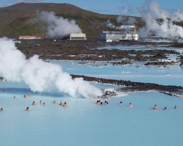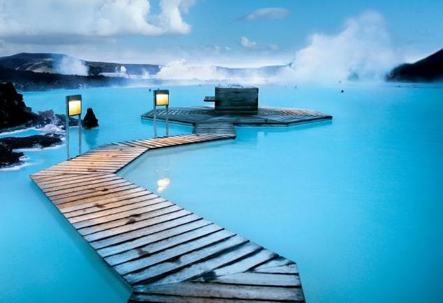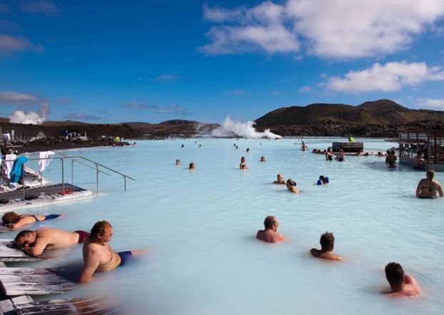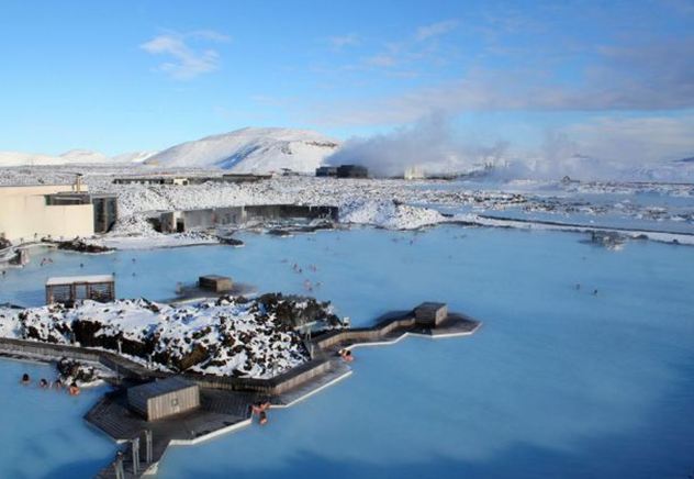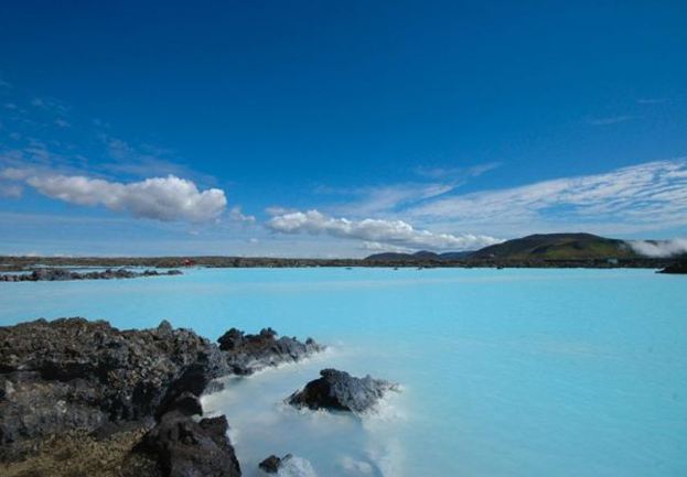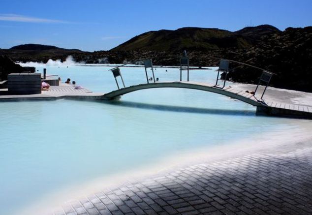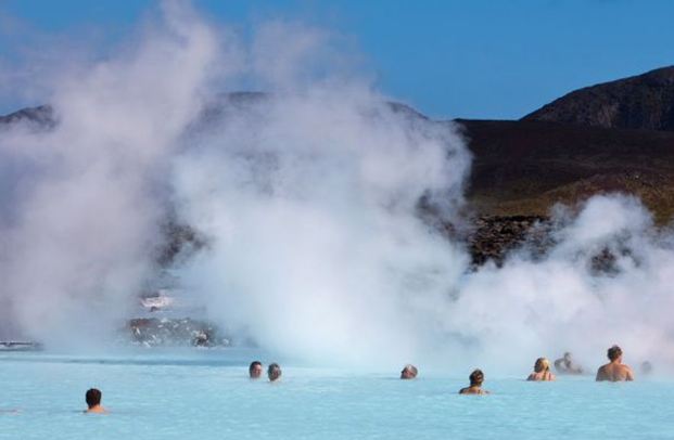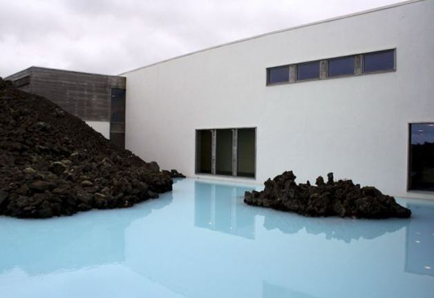 A Lagoa Azul possui dois banhos de vapor. Um deles tem uma estrutura parecida com uma caverna, constituída a partir de rochas de lava vulcânica. O outro possui paredes brancas e oferece uma vista da lagoa. Os banhos atingem uma temperatura média de 45ºC.